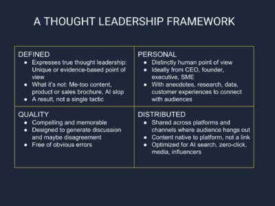 One thing that is new is the interest in thought leadership content as an antidote to AI slop. There’s essentially no limit to the number of blog and LinkedIn posts artificial intelligence tools can produce for a leader or subject matter expert.