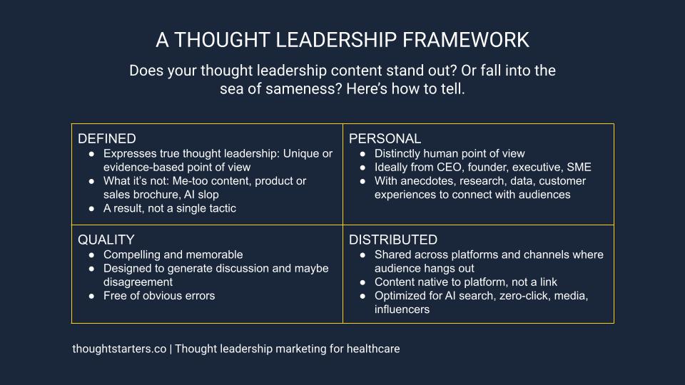 Just this summer I’ve read a new book called The ROI of Thought Leadership, digested the 2025 edition of the Edelman-LinkedIn Thought Leadership Impact Report, listened to this podcast and this one (both on thought leadership marketing in healthcare), and noticed the dozens of posts about thought leadership that wound up in my LinkedIn feed.